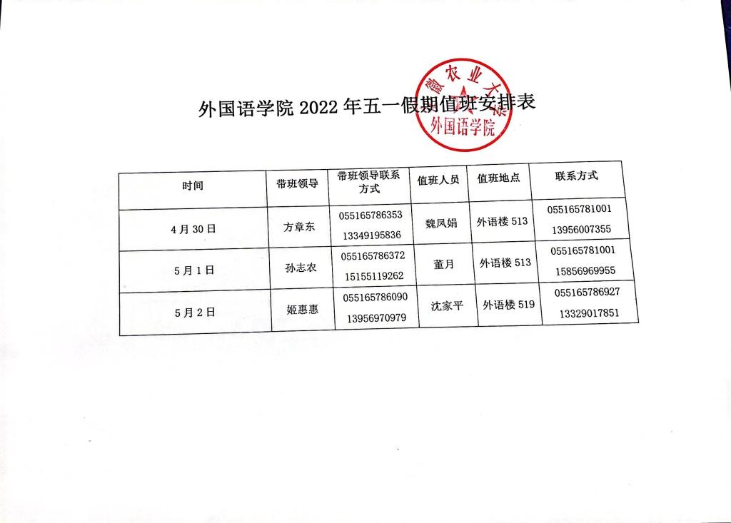 外国语学院2022年五一假期值班安排表