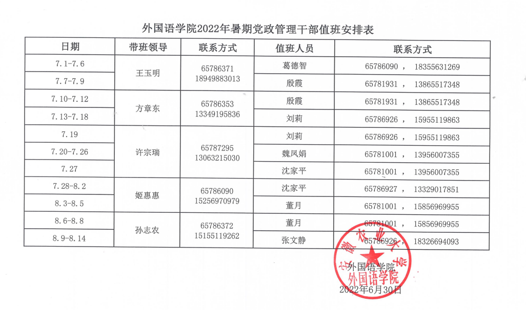 外国语学院2022年暑期党政管理干部值班安排表