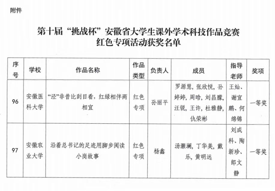 本网讯 近日,第十届“挑战杯”安徽省大学生课外学术科技作品竞赛红色专项活动和第九届安徽省“互联网+”大学生创新创业大赛获奖名单双双公布,我院英语系刘成科等教师牵头指导的两支队伍均获得优异成绩。