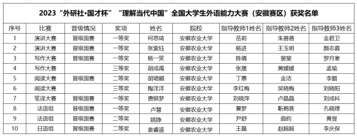 本网讯 近日,由安徽省教育厅主办、蚌埠医学院承办的2023“外研社·国才杯”“理解当代中国”全国大学生外语能力大赛安徽赛区比赛结果公布,我校学生取得了优异成绩。外国语学院英语系、日语系、法语系、公共外语教学部指导教师团队,指导我校外语专业和非外语专业学生在英语演讲、写作、阅读、笔译及法语组、日语组比赛中共获得一等奖5项、二等奖3项、三等奖2项,同时拿到了8张晋级国赛的入场券,我校总体成绩在全省高校中名列前茅。