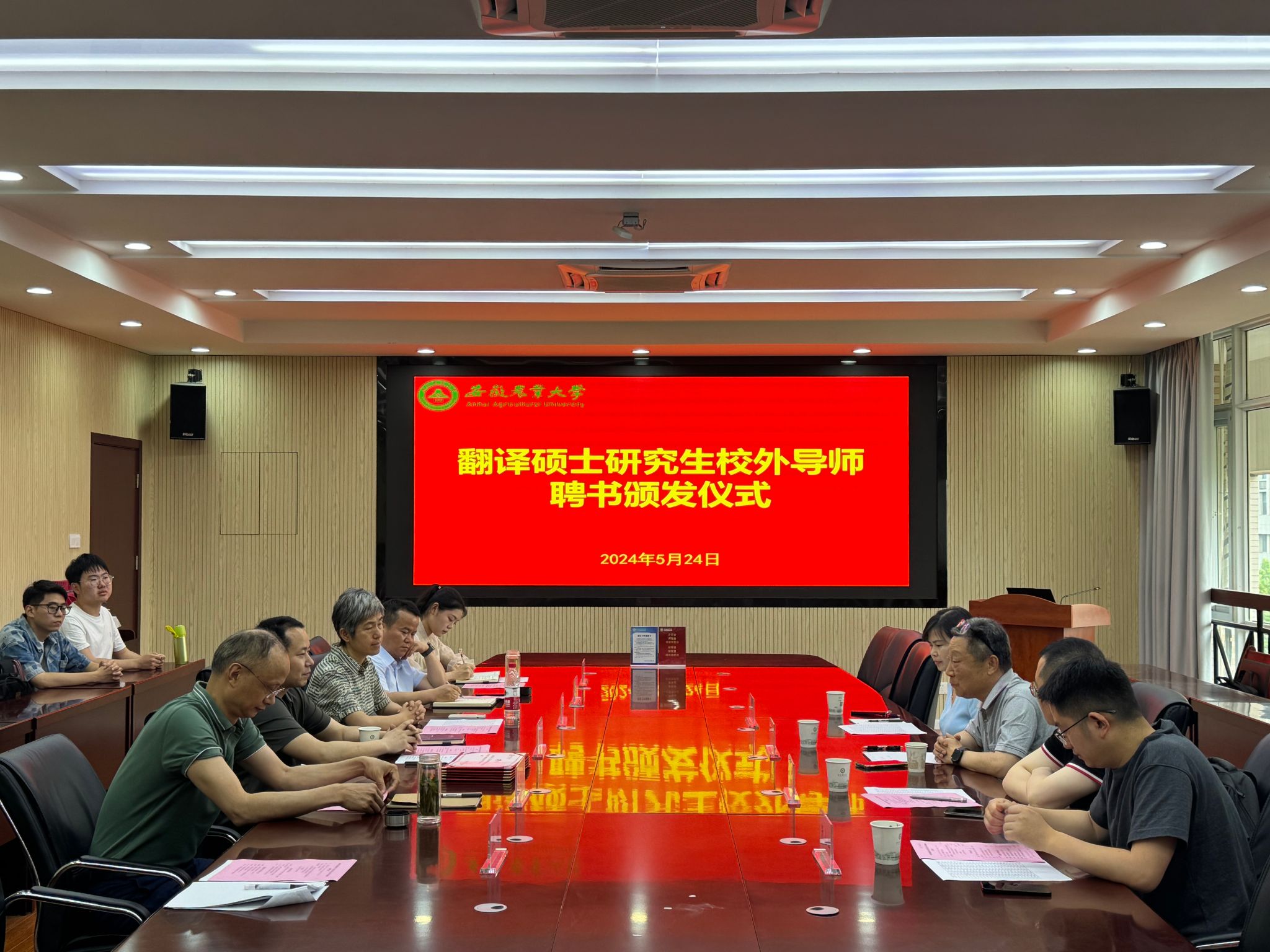 本网讯 5月24日下午,外国语学院举办翻译硕士研究生校外导师聘书颁发仪式。原合肥市政府外事办公室外事翻译、友城处处长、翻译室主任王冀皖,合肥立创信息系统有限公司总经理武博,安徽科学技术出版社编辑左慧,安徽译创语言有限公司执行总监朱小二,以及外国语学院副院长张文静,英语系主任、翻译硕士学位点负责人刘成科,英语系教授孙志农,2023级翻译硕士研究生及辅导员等参加了活动。活动由副院长许宗瑞主持。