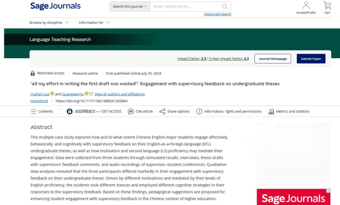 本网讯 近日,我校外国语学院英语系罗月寒博士在语言学领域国际期刊《Language Teaching Research》(中科院一区Top,IF: 4.3), 在线发表了题为“‘All my effort in writing the first draft was wasted!’: Engagement with supervisory feedback on undergraduate theses”的研究论文,该篇论文探究了英语专业本科生对导师反馈的参与度及影响因素。