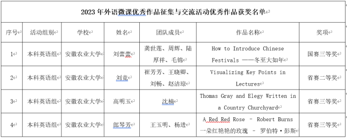 本网讯 近日,由教育部全国高校教师网络培训中心、高等教育出版社、《中国外语》共同主办的2023年外语微课优秀作品征集与交流活动全国优秀作品名单公布,我校外国语学院参赛团队荣获全国三等奖1项,省级二等奖1项、三等奖2项,充分展示了学院教师扎实的数字化外语教学能力和积极探索外语教育技术的精神风貌。