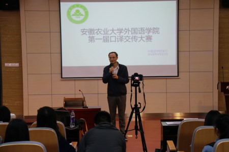 本网讯 4月17日晚,外国语学院第一届口译交传大赛暨第八届全国口译大赛(英语)“LSCAT”杯安徽农业大学校园选拔赛在外语楼502多功能报告厅成功举行。外国语学院院长孙志农教授亲自莅临比赛现场,来自英语系翻译工作坊的五位老师承担了大赛的评委工作,同时出席大赛的还有各位选手及其他师生。
