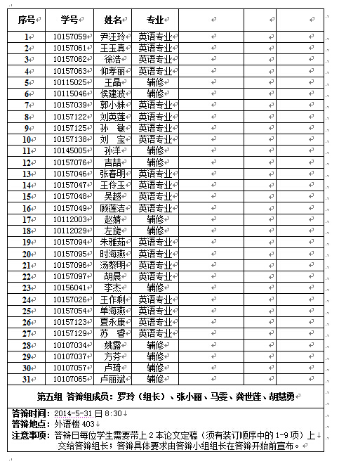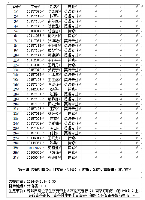 2. 6月7日下午2:30所有学生必须把修改后的论文存档稿交到外语楼507办公室,届时会有专人收取。存档稿只需1份,必须有装订顺序中1-12项和毕业论文任务书,且论文1-9项中除中文封面外一律双面打印;毕业论文任务书有且只有三页,宋体,小四字号,封面信息居中,否则拒收。