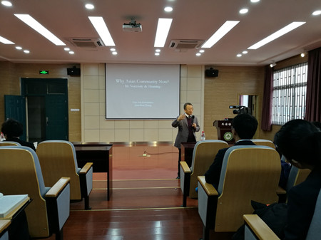 本网讯12月7日下午,在外国语学院502多媒体报告厅,日本同一亚洲财团首席研究员郑俊坤教授给大家带来了题为《亚洲命运共同体的必要性及其意义》的精彩讲座。这次讲座是外国语学院日语系主办的“亚洲命运共同体”大型学术讲座的第十一讲。讲座由日语系主任王磊主持,日语系师生以及安徽新华学院的部分老师聆听了讲座。