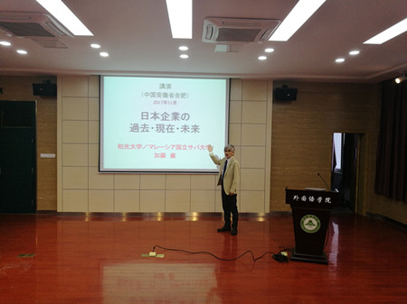 本网讯11月28日下午,日本和光大学经济学院加藤严教授应邀在我校外国语学院502多功能报告厅做了题为《日本企业的过去,现在,未来》的精彩讲座,这是外国语学院日语系主办的“亚洲命运共同体”大型系列学术讲座的第九讲。讲座由外国语学院日语系主任王磊主持,外国语学院副院长张剑韵教授以及日语系师生聆听了讲座。
