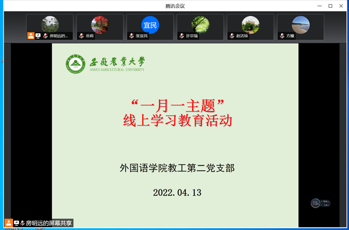 本网讯 4月13日,外国语学院教工第二党支部利用腾讯会议开展四月份“一月一主题”学习活动。支部书记陆厚祥主持,学院党委书记方章东、副院长许宗瑞及支部全体党员齐聚云端,全程参与。