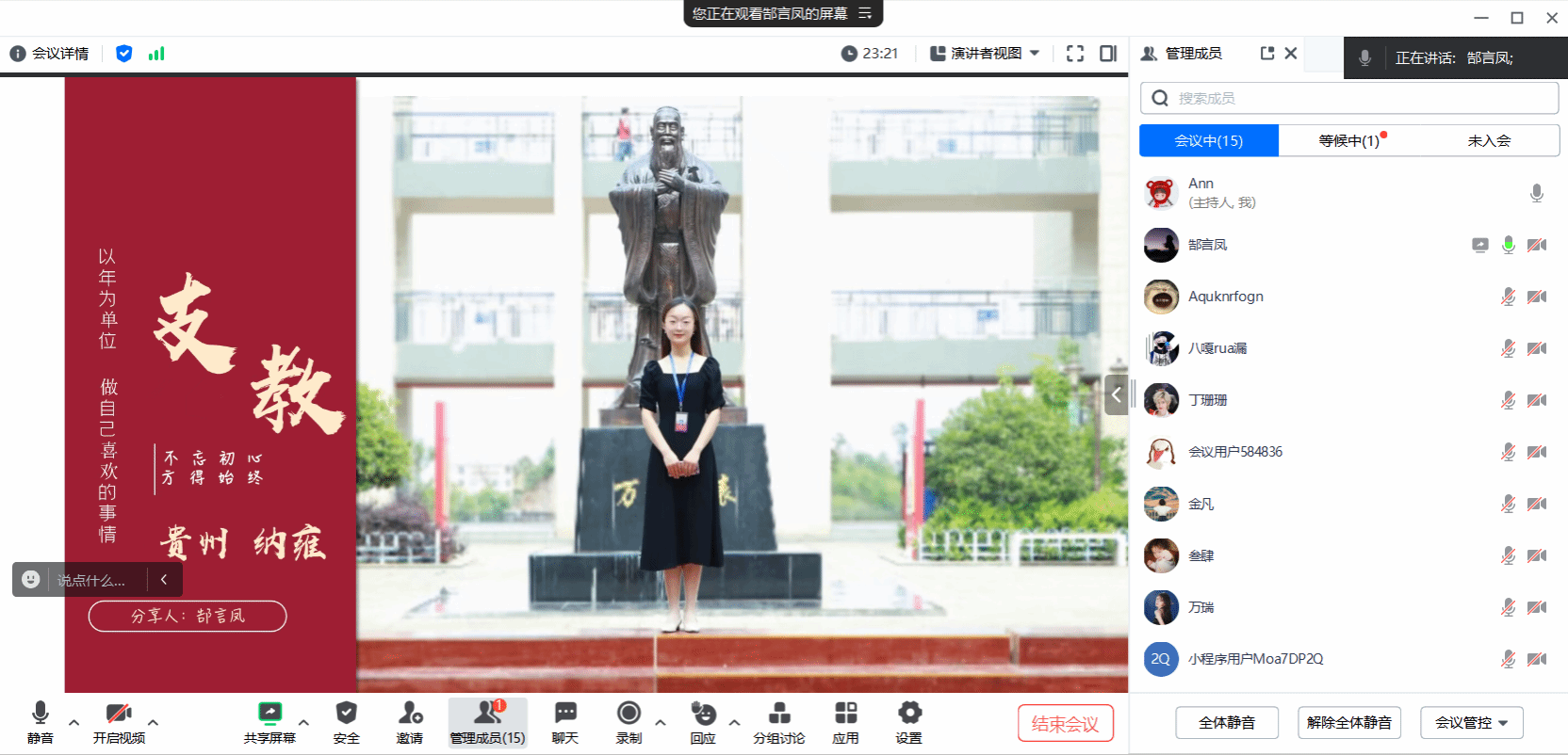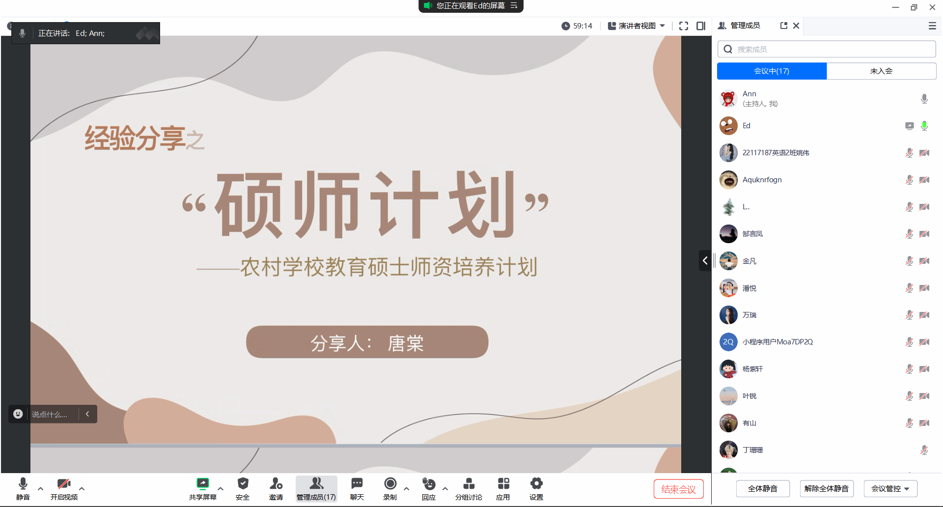 作为安徽农业大学第24届研究生支教团志愿者成员、安徽省第十四届大学生职业生涯规划大赛金奖的获得者,郜言凤分享了她在贵州省纳雍县的支教情况和基层教育扶贫工作经历,她鼓励同学们以职业规划大赛为契机,学会客观地认识自己,选择适合自己的发展道路。作为入围安徽省首批“硕师计划”项目、现就职于安徽省利辛县阚疃金石中学的唐棠,她详细介绍了安徽省“硕师计划”项目实施的背景、目的、实施方案、申请条件以及评选程序等,还结合自己的教学经历,分享了她对乡村英语教学的思考和想法,鼓励同学们将个人理想追求融入党和国家事业之中,为农业农村现代化和乡村振兴积极贡献力量。