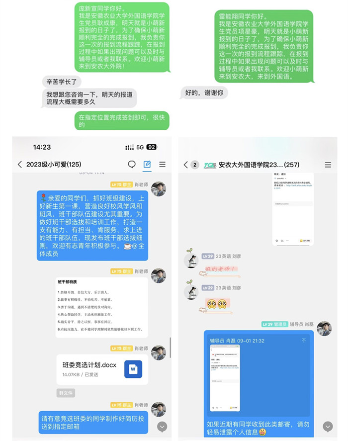 学院第一时间组建2023级新生群,学生加群申请发出后,第一时间审核通过,学生在群里问的问题,第一时间答复,打造高效外院。新生分班完成后,学院发挥学生党员的先锋模范作用,40名党员对接54个新生宿舍,在报到前通过短信的形式“点对点”帮扶新生,打造魅力外院。新生出发前,叮嘱新生注意事项,确保每位新生平安、顺利到校报到。