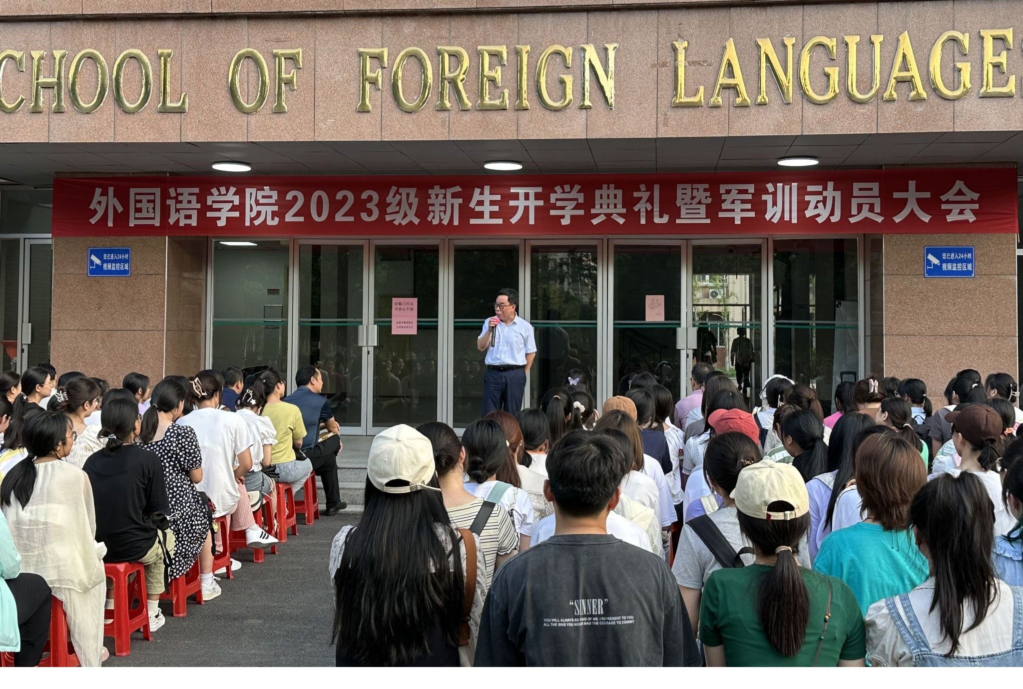 9月8日下午,在外语楼门前举办了2023级新生开学典礼暨军训动员大学,强调青年学生要立志,人无志不立,国无志不强,要志存高远,胸怀祖国和世界;要博学,把语言与社会发展、国家富强结合起来,博学多识;要珍惜,珍惜青春,大学四年漫长而又短暂,做好规划,珍惜健康,健康的身体是学习和生活的重要保障;要感恩,感恩家人、学校和社会的关心和支持。军训是大学教育的重要一环,意在锻炼体魄、磨练意志,激发吃苦耐劳的精神和爱国卫国的意志,要严格落实、积极参与,为四年的大学生活打下良好的基础。