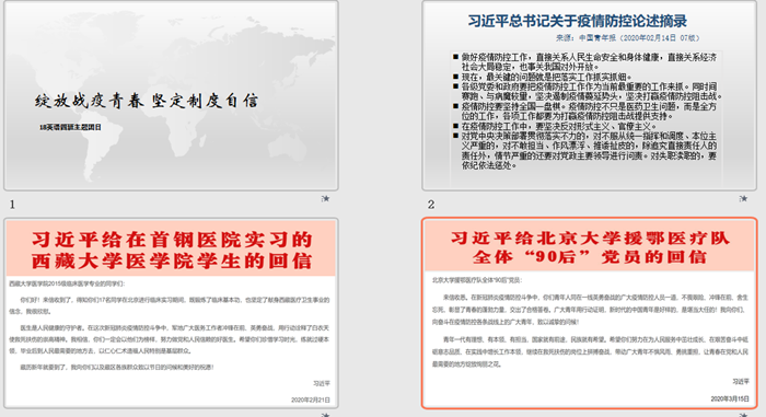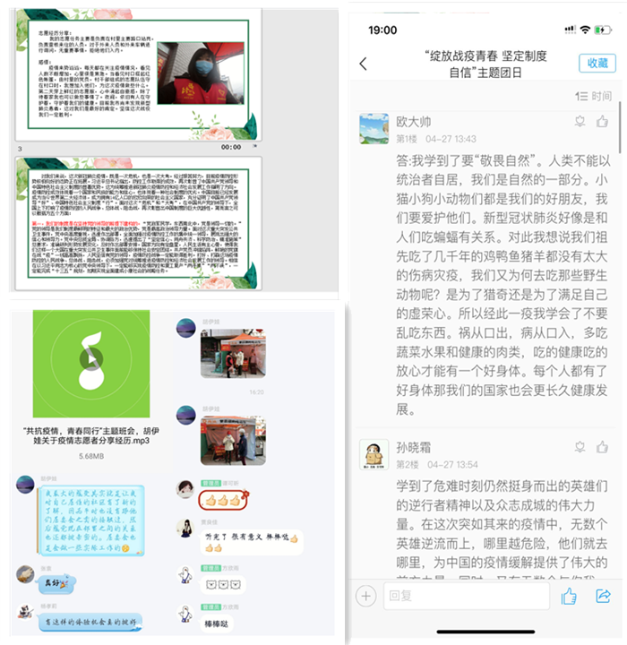 各支部依托QQ群、微信群等网络平台,认真学习习近平总书记在湖北考察疫情防控工作重要讲话精神和给首钢医院实习的西藏大学医学院学生的回信、给北京大学援鄂医疗队全体“90后”党员的回信精神、对新时代青年的寄语,积极讨论,热烈发言,明确新时代新青年的责任与担当。