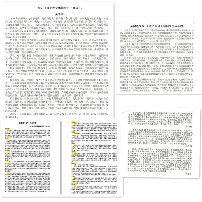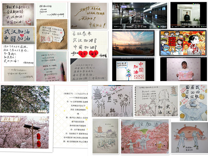 同学们纷纷发挥所长,通过暖心文字、手绘图片、摄影作品、祝福视频、歌曲创作等方式,为武汉加油,为中国加油。丰富多彩的绘画、行云流水的文字、优美动听的旋律流淌着同学们对武汉和国家的祝福,相信一定可以战胜疫情,再去武汉看美丽的樱花。