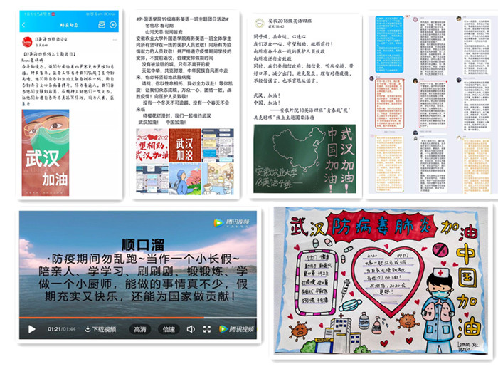 学院各班级依托QQ群、微信群等网络平台,认真学习习近平总书记关于新冠肺炎疫情重要讲话和重要指示精神,学习《教育部致全国大学生的一封信》、《安徽省教育厅致全省广大学生和家长的一封信》及学校《致安农全体同学的一封信》,参加“青年大学习”网上团课,参加校团委举办的疫情防控网络知识竞赛,增强班级同学的疫情防控意识。