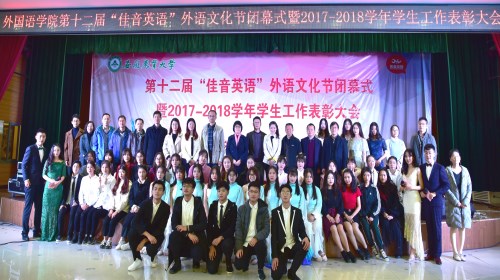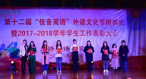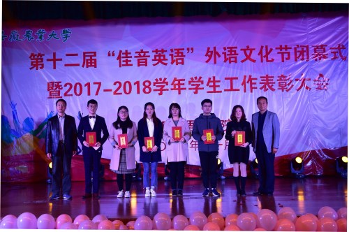 本网讯 11月28日晚,外国语学院第十二届“佳音英语”外语文化节闭幕式暨2017-2018学年学生工作表彰大会在欣苑小礼堂隆重举行。校学生处处长彭庆刚、招生就业处处长刘海涛、团委副书记任琪,合肥佳英英语学校人事经理刘媛和人事助理杜蓉,学院党政领导姚莉、孙志农、王玉明、黄庆华和各系部主任和专兼职辅导员们参加了此次活动。出席活动的还有学院受表彰的集体和个人以及2018级学生。