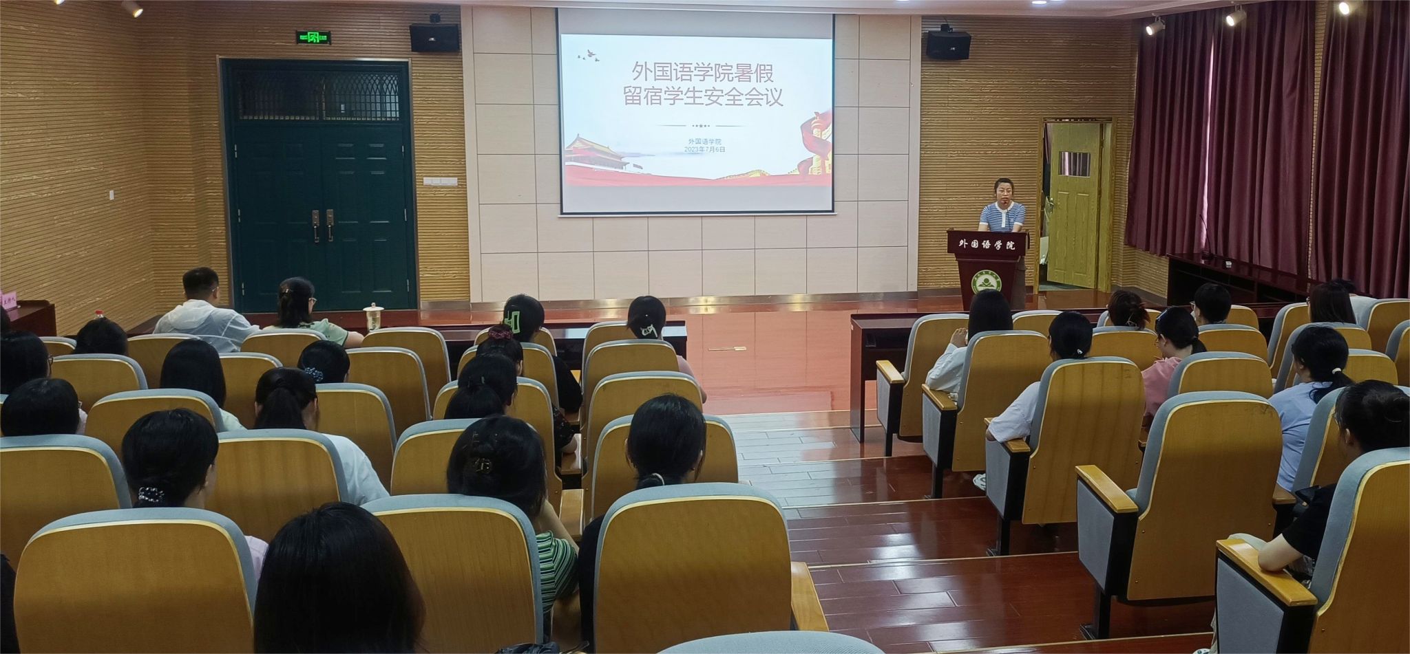 为进一步加强暑期留校学生安全教育,确保暑期校园安全稳定,7月6日上午,外国语学院在外语楼502报告厅召开暑期留校学生安全教育大会,学院全体留校学生、相关辅导员参会,会议由学院党委副书记姬惠惠主持。