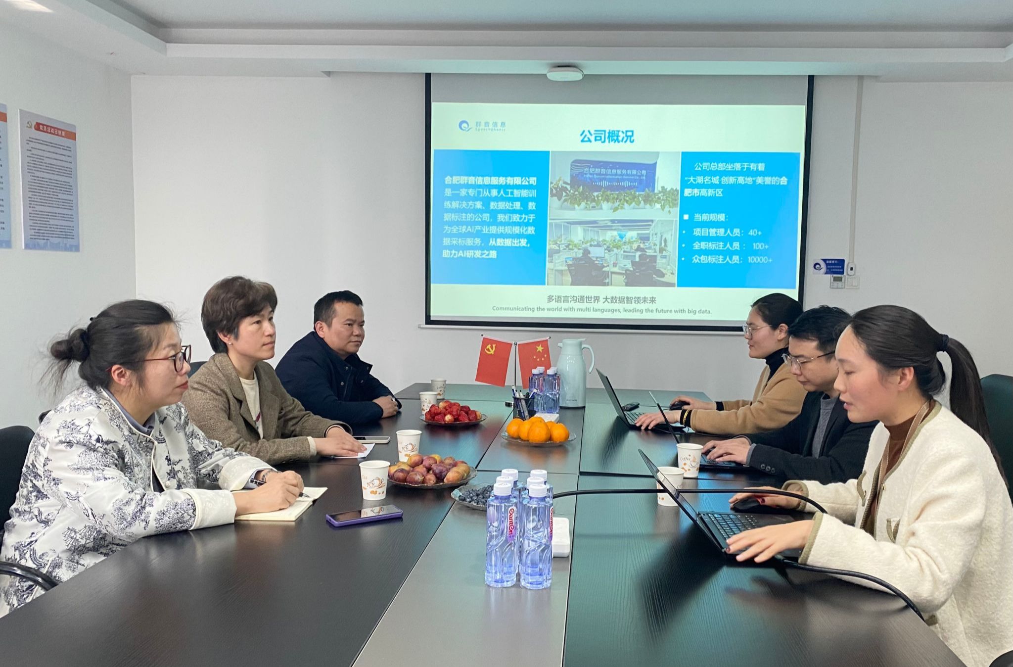 合肥群音信息服务有限公司副总经理李天洋、业务部经理胡环环、人事经理曹慧影等对外国语学院一行热情接待并开展座谈交流,并就企业的业务布局、发展趋势以及对人才的需求等方面进行了介绍,表示热切希望通过校企交流互动,共同开拓发展空间,实现人才共育和合作共赢。随后,双方就实习基地建设、人才共育、课程设置以及实践教学等方面进行了深入的探讨和交流。外国语学院表示,期待与公司在实习基地建设方面开展更加紧密的合作,为学院毕业生提供更多的实习机会、就业岗位和职业发展资源。