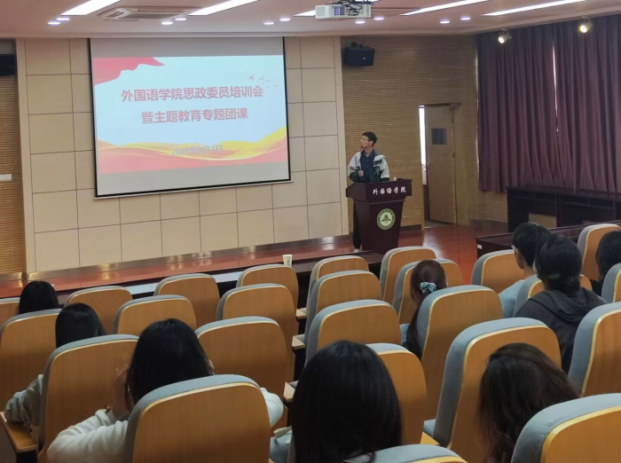 本网讯 为深入学习贯彻习近平新时代中国特色社会主义思想主题教育,充分发挥思政委员在大学生自我教育、管理服务和思政教育的主体作用,5月7日,外国语学院在502报告厅举办思政委员培训会暨主题教育专题团课。学院全体思政委员参加会议,会议由学院团委负责老师主持。