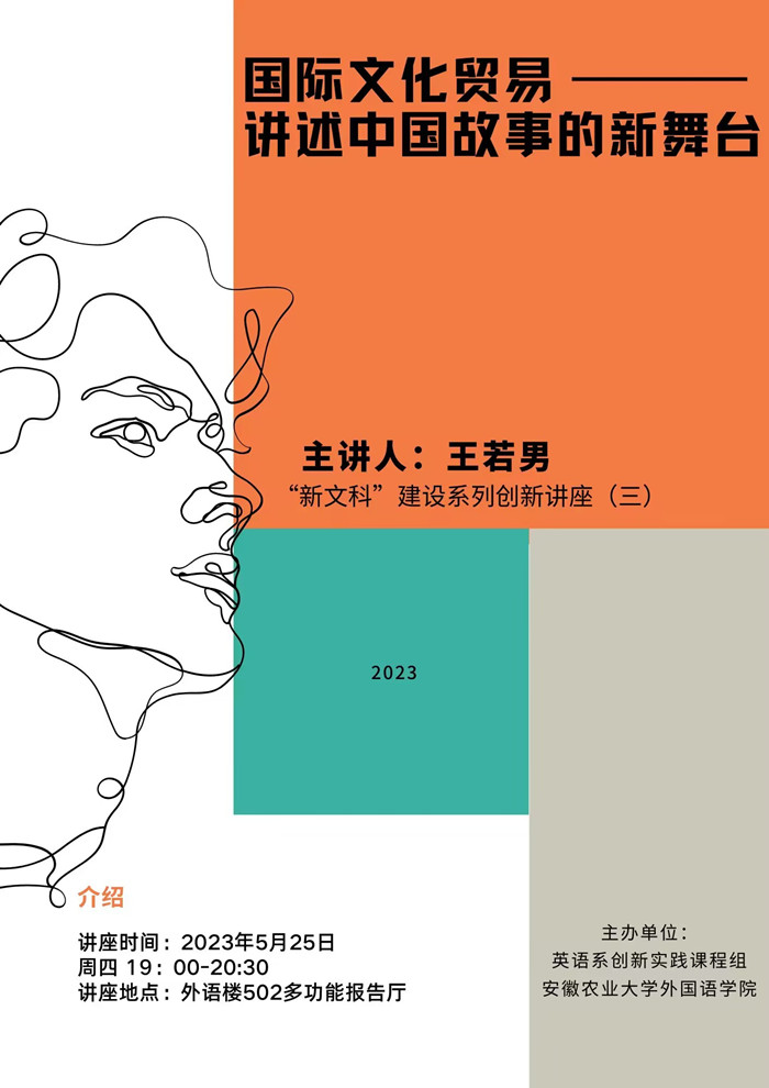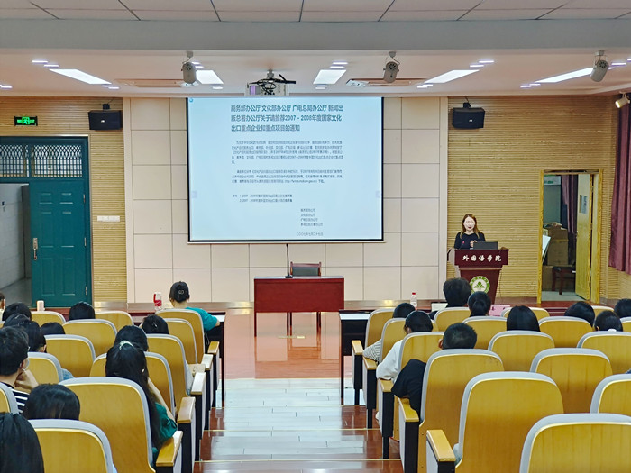 本网讯 5月25日晚,由英语系创新实践课程组承办的“新文科”建设系列创新讲座第三讲在外语楼502多功能报告厅如期举行。本期主题为“国际文化贸易——讲述中国故事的新舞台”,由英语系青年教师王若男博士主讲,来自英语与商务英语专业的200余名学生参加了本次活动。