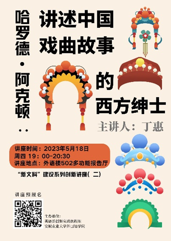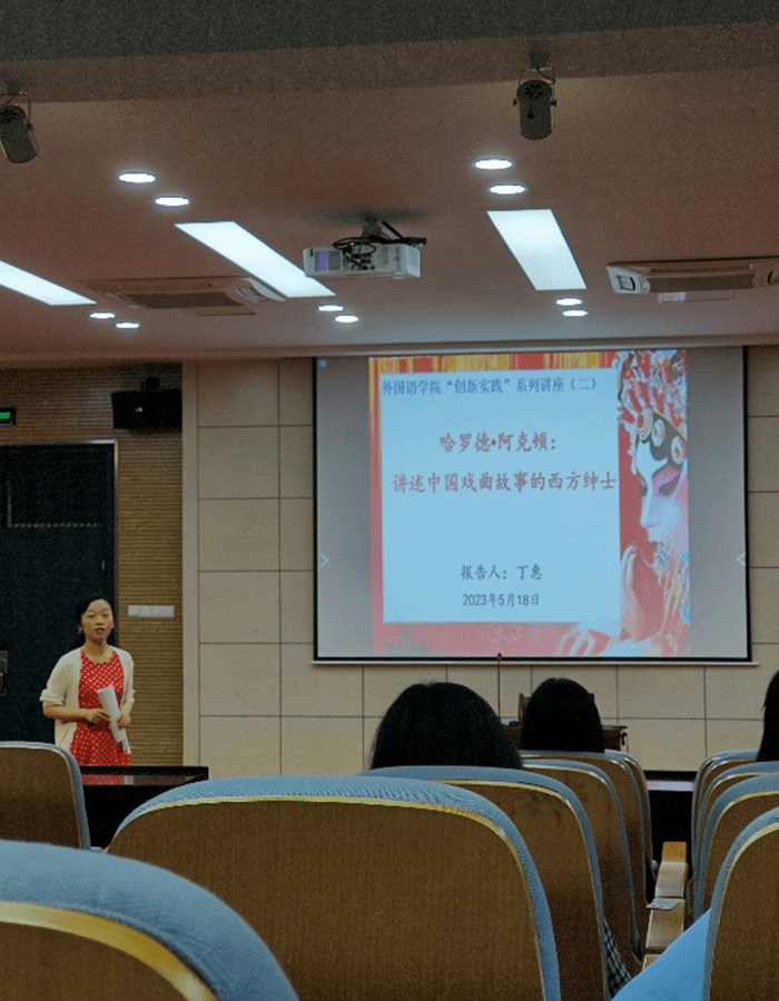本网讯 为深入贯彻落实习近平总书记关于讲好中国故事、传播好中国声音的重要讲话指示精神,5月18日晚,英语系创新实践课程组承办的“新文科”建设系列创新讲座(第二讲)在外语楼502多功能报告厅顺利举行。本次主题为“哈罗德•阿克顿:讲述中国戏曲故事的西方绅士”,由英语系丁惠副教授主讲,来自英语与商务英语专业各年级150余名同学参加了此次讲座。
